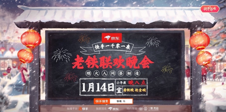1月14日晚8点,由京东电器独家冠名、一汽大众揽胜特约播出的“快手一千零一夜老铁联欢晚会”如约而至,近百位明星达人齐聚快手直播间,与来自天南海北的老铁欢喜相逢,共庆小年夜。在长达两个半小时的直播中,明星大咖与快手用户同台,经典旋律与热血国风融合,温情故事与唯美画面交织,带来了一场真正属于老铁的视听盛宴,也将直播间人气不断推向新高。