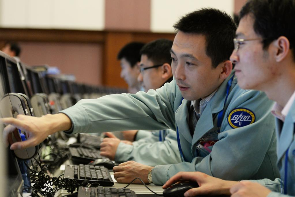 于天一(右二)在北京航天飞行控制中心指挥大厅参加嫦娥三号任务(2013年12月10日摄)。