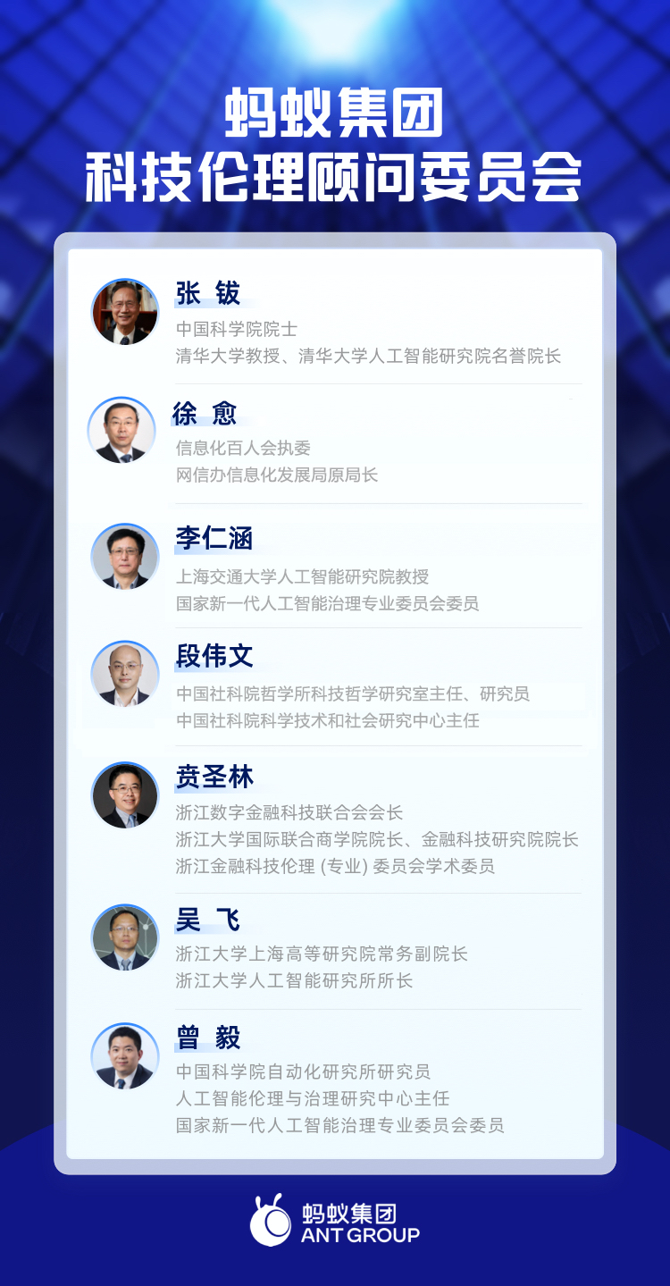 据悉,7位顾问委员,不仅有专注人工智能治理等科技领域专家,也包括哲学、金融等社会学科专家。未来,顾问委员会将以研讨会、年度评估等形式开展工作,包括参与蚂蚁集团重要项目沟通评估、年度科技伦理建设工作评估、指导相关课题研究等。