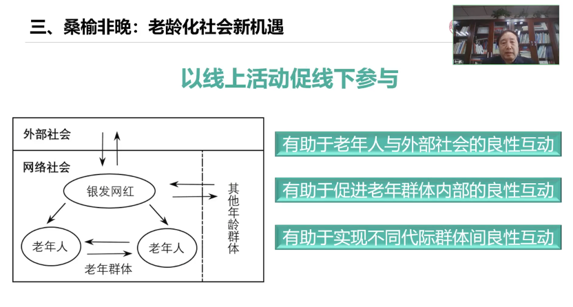 此外,杜鹏还基于过往的研究经验,总结了老年人线上活动促进线下参与的三方面机制。首先,参与短视频创作等线上活动有助于老年人实现与外部社会的良性互动,“通过‘银发网红’让年轻人看到和理解老年人的生活状态”;其次,有助于促进老年人内部良性互动,“也就是老年人之间的带动作用,通过‘银发网红’影响观看短视频的老年人主动改变生活状态,主动学习和参与到精彩的社会活动中”;再次,有助于实现不同代际间群体间的良性互动,促进老年人与年轻人、子女、孙子女之间的互动,帮助不同年龄人群之间的相互了解。