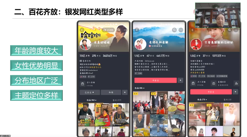 他还举例了@我是田姥姥、@老把头和老谢、@阿木爷爷等抖音上非常受欢迎的老年创作者,认为他们积极的生活态度具有较强的社会价值,建议政府和平台加大扶持力度,并将这些“桑榆未晚”的典型案例传播出去,为更多老年人提供社会参与的新思路。“抖音上的‘银发网红’具有年龄跨度大、地区分布广等特点,且女性创作者居多,占比约60%,她们的主题定位也十分丰富,记录生活型、搞笑娱乐型、知识分享型、技能展示型、互动型等应有尽有”,杜鹏详细总结到。
