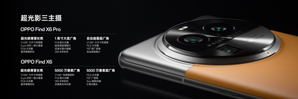 OPPO Find X6系列首次定义的超光影三主摄,突破手机多摄区分主次的传统,推动移动影像从多摄时代进入多主摄时代。Find X6系列广角、长焦、超广角三颗摄像头均采用领先的大底传感器技术与光学设计,让每一个摄像头都拥有旗舰级的光线捕捉性能,从近到远,从白天到夜晚都可以拍出旗舰水平的出彩画质。