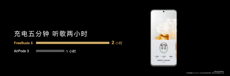 基于HarmonyOS能力,华为FreeBuds 5支持连接两台不同系统的设备;耳机盒开启后,附近的手机、平板、PC就会自动弹窗,并支持2副华为FreeBuds 5耳机同时连接到华为手机。在降噪关闭的情况下,机盒整机续航为30小时,较上一代提升36%,单耳机开启降噪为3.5个小时,关闭降噪则能达到5个小时,较上代提升25%。此外还支持超级快充,20分钟即可充满。耳机回盒5分钟,就能享受长达2小时的音乐聆听,较上一代充电速率提升了200%。