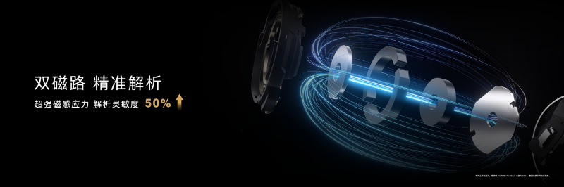 在外观升级的基础之上,华为FreeBuds 5的音质表现也迎来越级提升。耳机创新性地采用了“声电控”三分离设计,将发声单元、电池模组、控制电路板独立置于耳机各部位,互不干扰。同时搭载双环强磁体驱动的超磁感澎湃单元,采用11mm直径超大振膜,结合声压Turbo技术,使耳机拥有强劲动力、超大振幅,低音浑厚澎湃,人声细腻通透;在L2HC和LDAC™双高清编解码的加持下,华为FreeBuds 5呈现出全链路高保真音质。搭载超宽频实时听感优化算法,能够根据耳道结构、佩戴状态以及音量大小,实时智能计算,在2s内完成100Hz-2kHz的超宽频段精准补偿,维持了好声音的统一性和还原度。华为FreeBuds 5凭借在半入耳TWS领域内突破性的出色音质表现,再次大幅领先全行业。