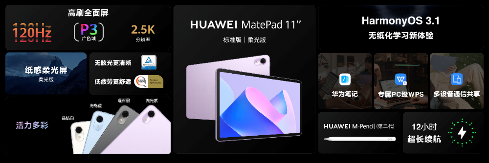 华为 MatePad 11 英寸2023款平板电脑发布。其中,华为 MatePad 11 英寸2023款柔光版搭载纸感柔光屏,搭配HUAWEI M-Pencil (第二代)柔光版搭载的柔光屏还原熟悉的纸感读写体验,书写不打滑更类纸;配置全新升级的HarmonyOS 3.1,PC级WPS Office、华为笔记、课程表FA卡片等更专业的软件生态,超级终端、远程PC、超级中转站的便捷协同,打造覆盖课堂内外、协同多端设备的一站式学习新体验。