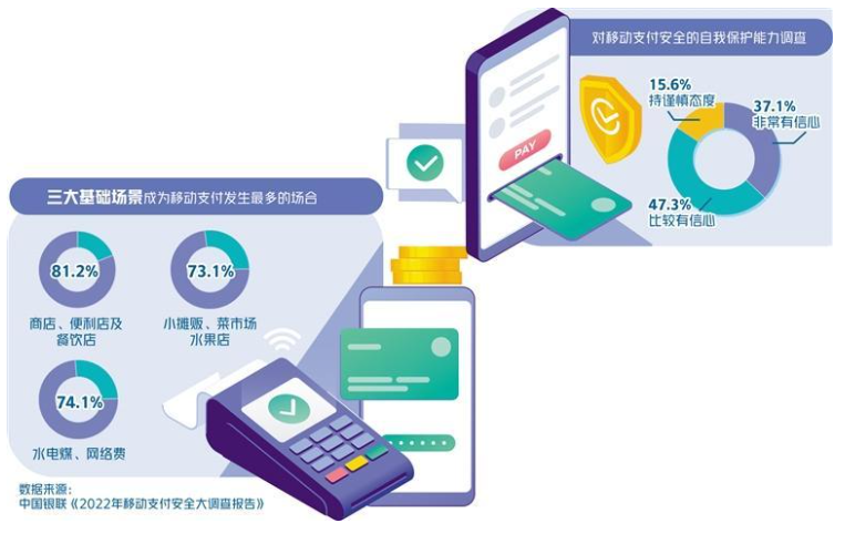 近日,中国银联发布《2022年移动支付安全大调查报告》(以下简称《报告》)显示,77.5%的手机用户每天都会使用移动支付,常用场景接近11个,较2021年进一步增长。截至2022年6月,我国网络支付用户规模达9.04亿,较2021年12月增长81万,我国移动支付整体市场覆盖率排名全球第一。