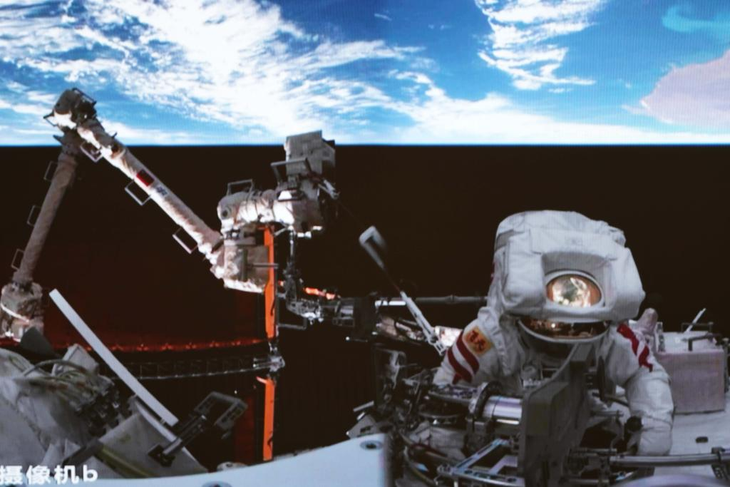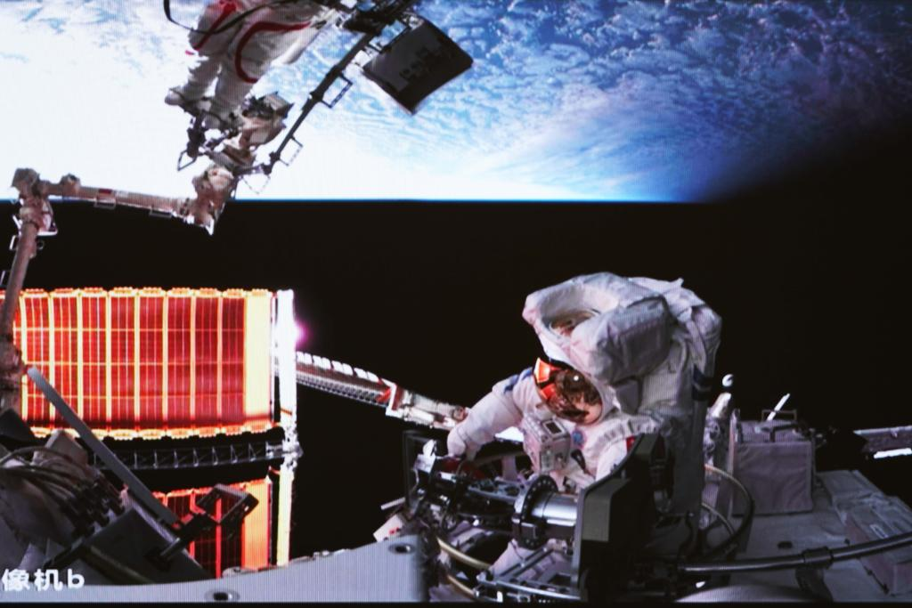 4月15日在北京航天飞行控制中心拍摄的神舟十五号航天员张陆开展舱外操作的画面。