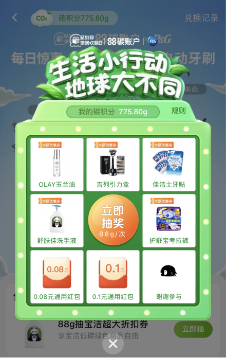 宝洁始终与阿里88碳账户在可持续发展战略上保持紧密的合作关系,自碳账户上线以来,宝洁已认证200款低碳商品。本次集团欢聚日活动,宝洁也联合88碳账户为消费者带来诸多专属绿色福利,呼吁大家从小事做起,购买绿色替换装商品。未来,宝洁与阿里也将持续在商品全生命周期的各个环节展开深入合作,携手共启绿色环保新愿景。