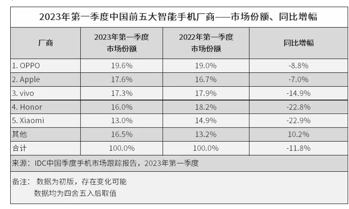 4月27日,国际数据公司(IDC)发布的最新数据显示,2023年第一季度,中国智能手机市场出货量约6,544万台,同比下降11.8%。IDC表示,2023年开年依然低迷,延续2022年以来每季度出货量同比下降幅度超10%。OPPO以19.6%的市场份额跃居国内手机市场第一。
