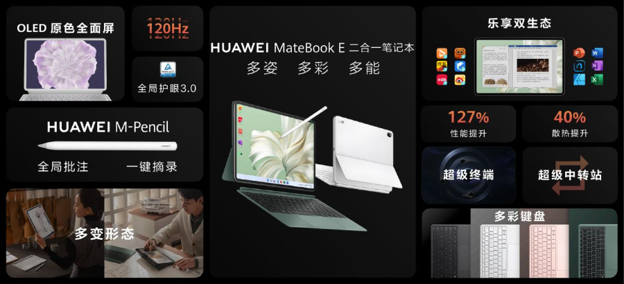据悉,全新的华为MateBook E 二合一笔记本采用了更先进的智能磁吸键盘,可拆可合,支持笔记本形态、分体形态、支架形态以及平板形态使用,能满足不用场景下的使用需求。同时搭载华为移动应用引擎,能实现乐享移动App,手机App登录华为应用市场,一键下载安装,部分应用支持平行视界,带来和平板一样的触控玩法。搭配第二代HUAWEI M-Pencil手写笔,华为MateBook E 二合一笔记本升级“一键摘录”、“全局批注”快捷笔记功能,拥有和华为平板一样的批注能力。这次升级中,华为MateBook E 二合一笔记本采用了全新升级至120Hz高刷新率的OLED屏幕,其屏占比高达90%,支持P3广色域、专业级高色准、600尼特高亮度,能满足专业人士的原彩呈现需求。处理器也升级到第12代英特尔酷睿处理器,性能相较上一代至高提升1.27倍。