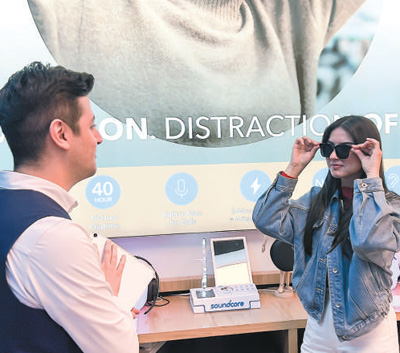 消费者在体验安克创新带有骨传导耳机功能的墨镜产品。穆罕默德·乔杜里摄