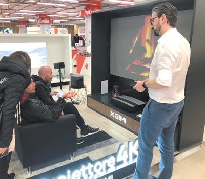消费者在极米科技位于意大利米兰一家电器商场的快闪店体验投影仪产品。邹 成摄