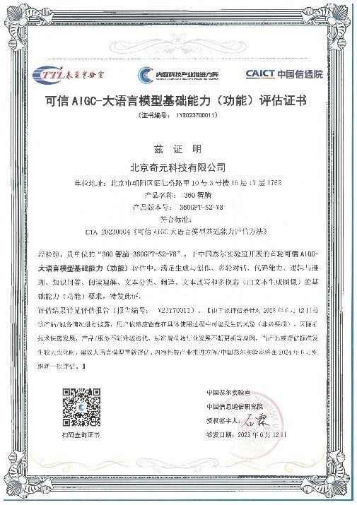 6月12日,360智脑的360GPT-S2-V8型号产品获得了中国信息通信研究院(以下简称“中国信通院”)“可信AIGC大语言模型基础能力”评估报告(以下简称“报告”),报告显示必选项目评估内容均通过。据悉,360智脑是国内首个通过中国信通院该项权威评估的大模型产品。