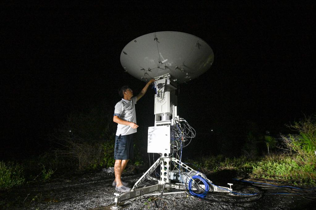 工作人员在位于海南省陵水黎族自治县的低轨信关站调试低轨卫星信号接收设备(6月13日摄)。在此次测试中,该设备用于接收远海回传信号。