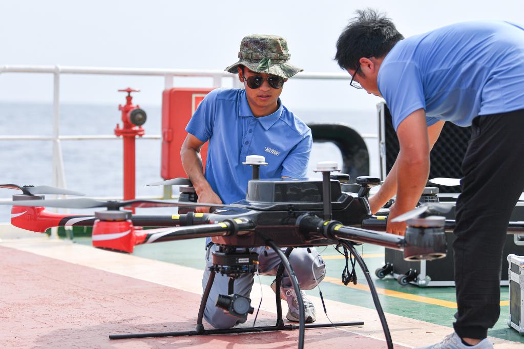 工作人员在“电科1号”综合试验船上操控无人机,配合此次远海测试(6月15日摄)。