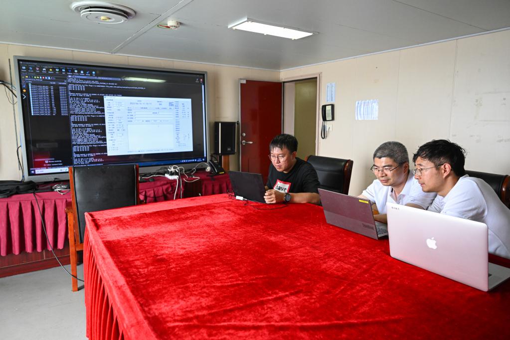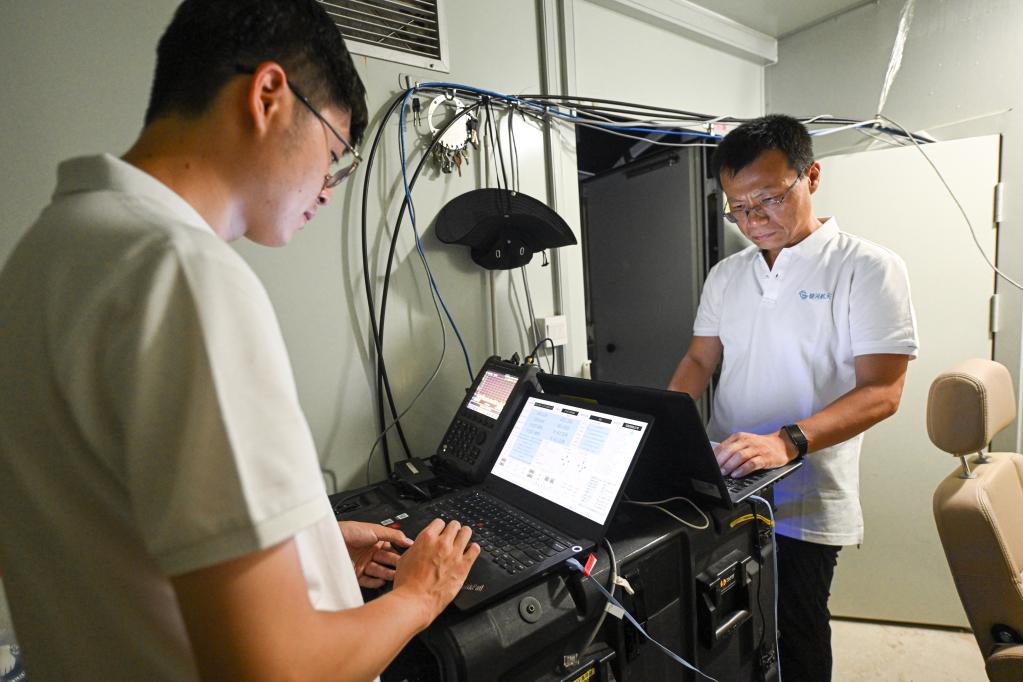 工作人员在“电科1号”综合试验船上验证高低轨卫星、无人机协同通信覆盖能力(6月15日摄)。
