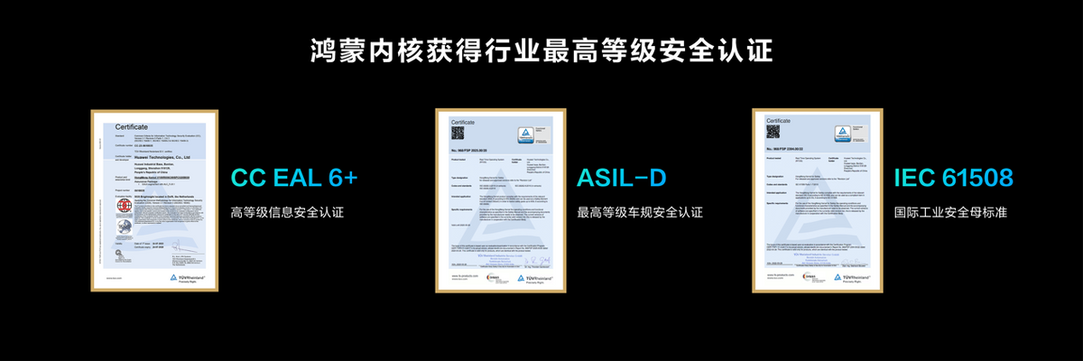 鸿蒙内核匹配终端用户习惯和终端任务特点,通过变公平调度为动态优先级调度、混合动态大页的内存管理机制以及高效的组件间通信机制,让系统更加流畅。同时,鸿蒙内核还创新设计了更轻量的并发模型,更匹配移动算力架构的资源供给,更精准的器件控制,进一步提升了硬件的能效表现。最后,鸿蒙内核基于无RooT权限的安全设计,针对安全体系中关键模块进行形式化证明,用数学方法从源头验证系统的正确性。鸿蒙内核卓越的安全能力获得了业界高度认可,获得了全球首张智能终端操作系统领域CC EAL 6+证书,最高等级的车规安全认证ASIL-D,以及工业领域功能安全认证IEC 61508等等。