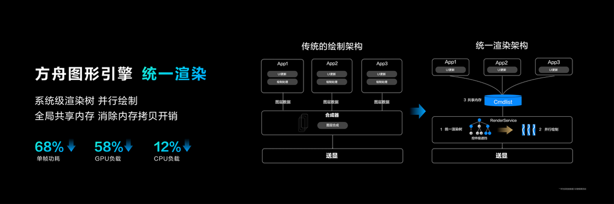 其次龚体介绍了华为方舟图形引擎,通过高效的统一渲染,有效降低渲染功耗,把声明式开发的理念延伸到动效开发,帮助开发者用简洁的方式,开发出高端、精致、流畅的动效。不仅如此,华为方舟图形引擎还带来了全新的视窗绘制框架,将GPU和CPU之间的交互方式由命令式改为数据驱动,不仅减少了CPU和GPU之间的交互,也消除了重复绘制,大大降低CPU与GPU的能耗。