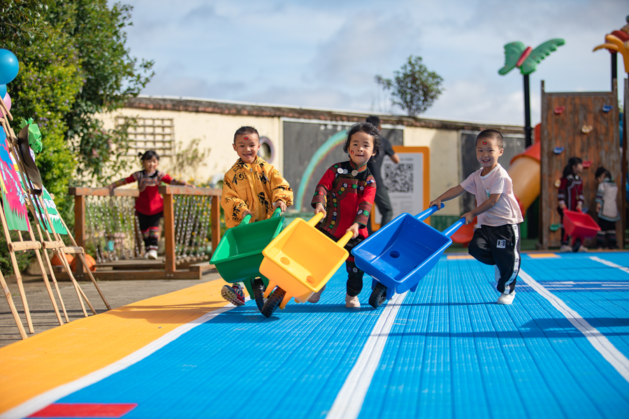 全国第281座美团乡村儿童操场,云南省红河州元阳县新街镇全福庄幼儿园的小朋友在新操场上玩耍