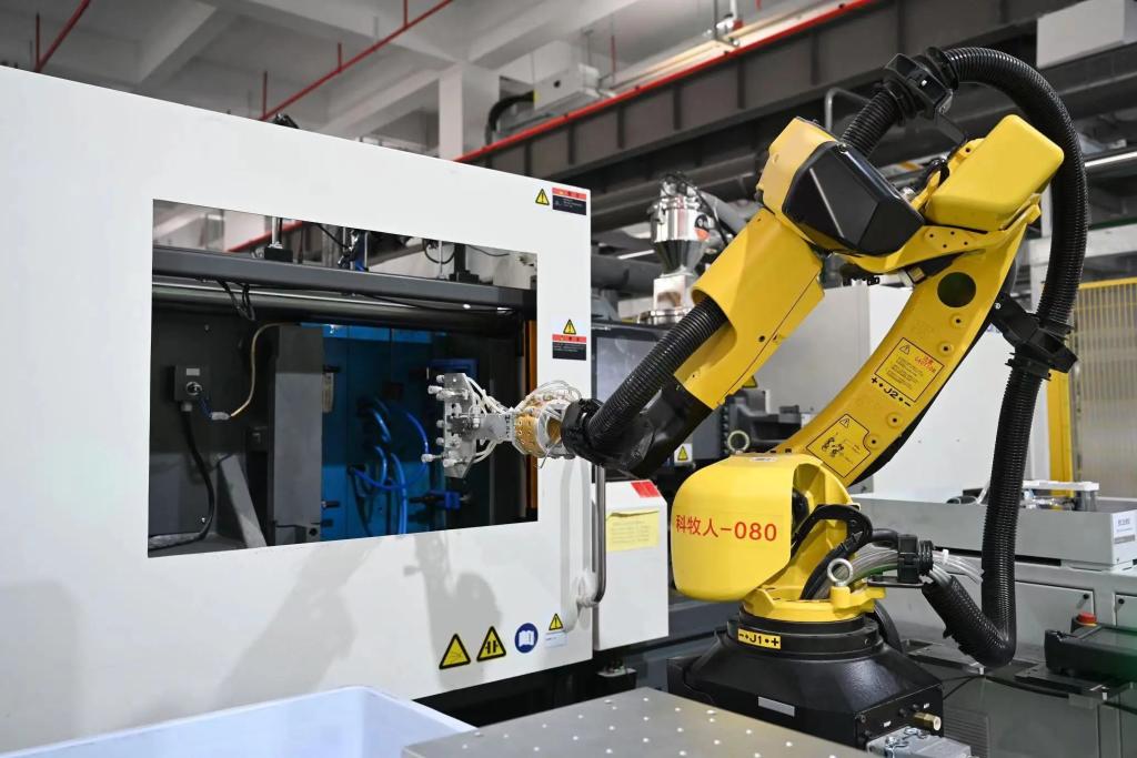 在福建省南安市九牧高端“灯塔工厂”,机械臂在流水线上作业。新华社发(周义摄)