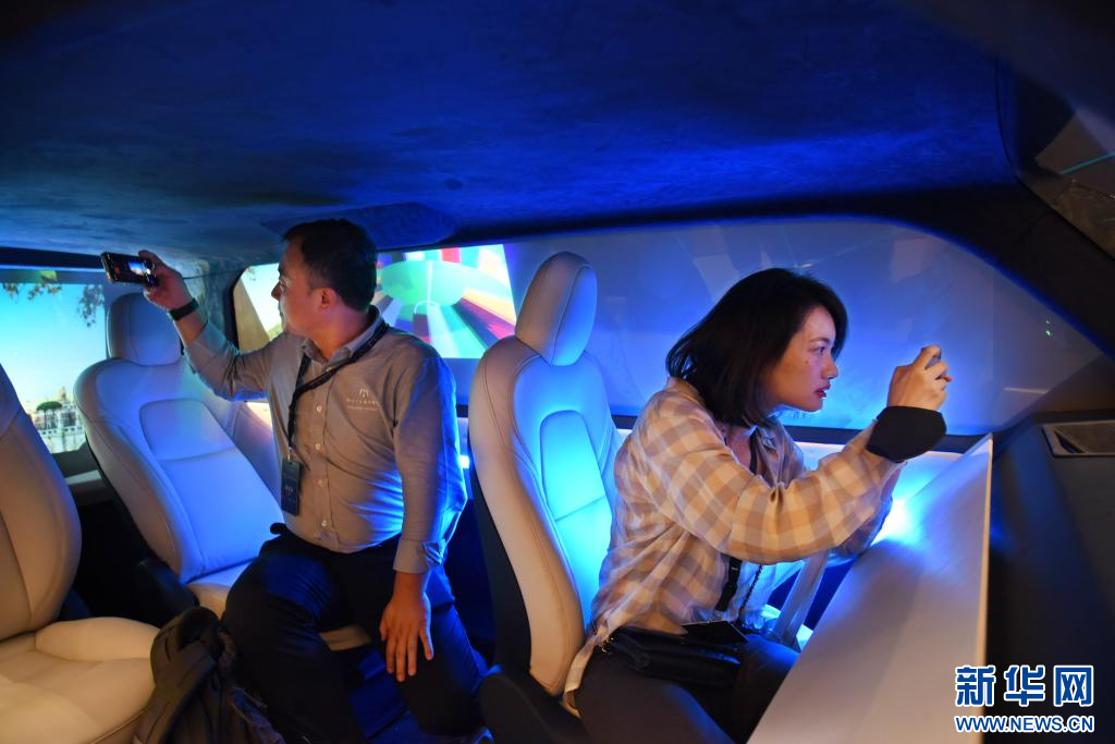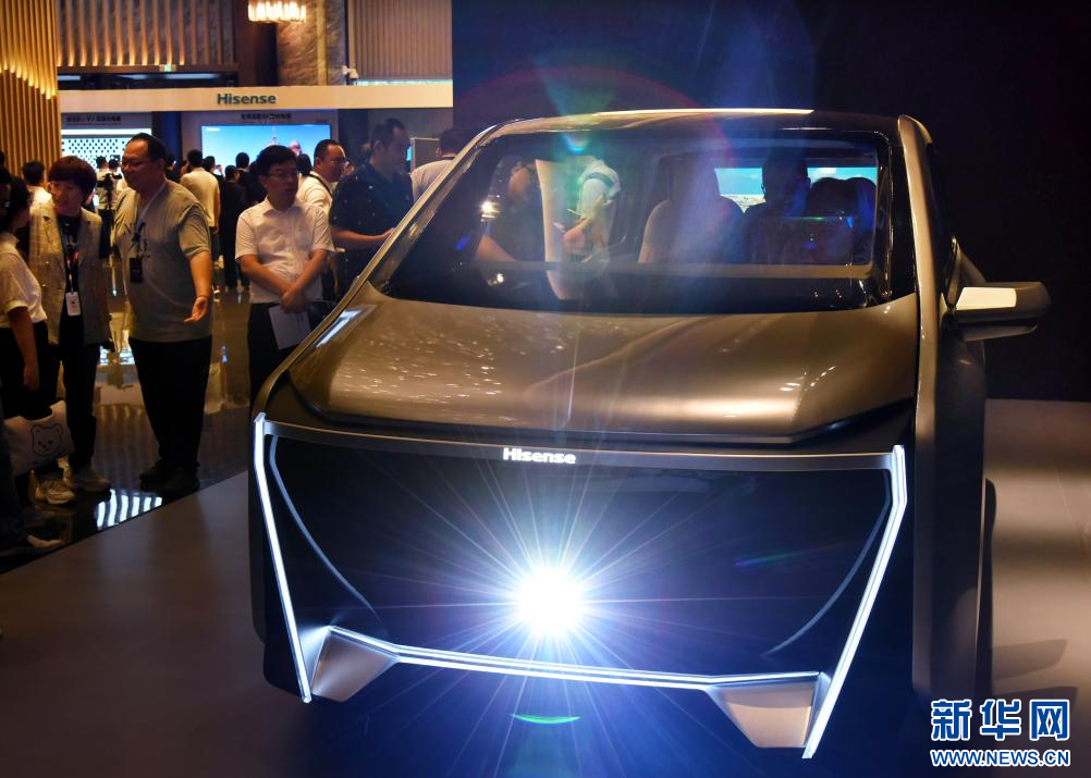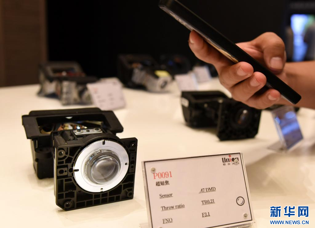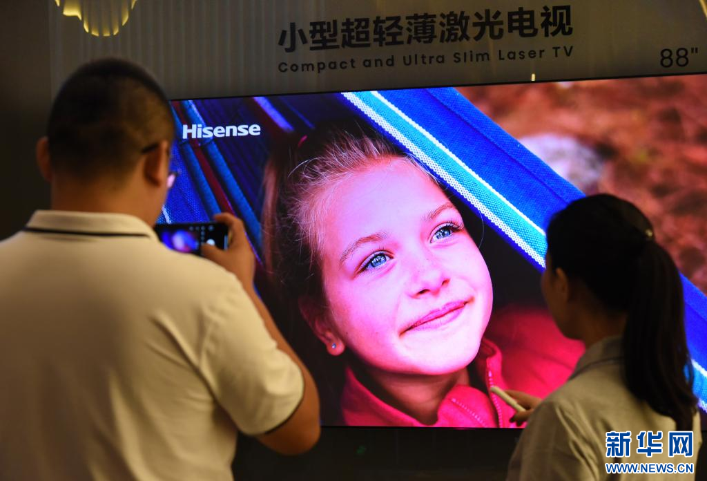 9月19日,参会者在激光显示技术成果展示区观看一款超轻薄激光电视。