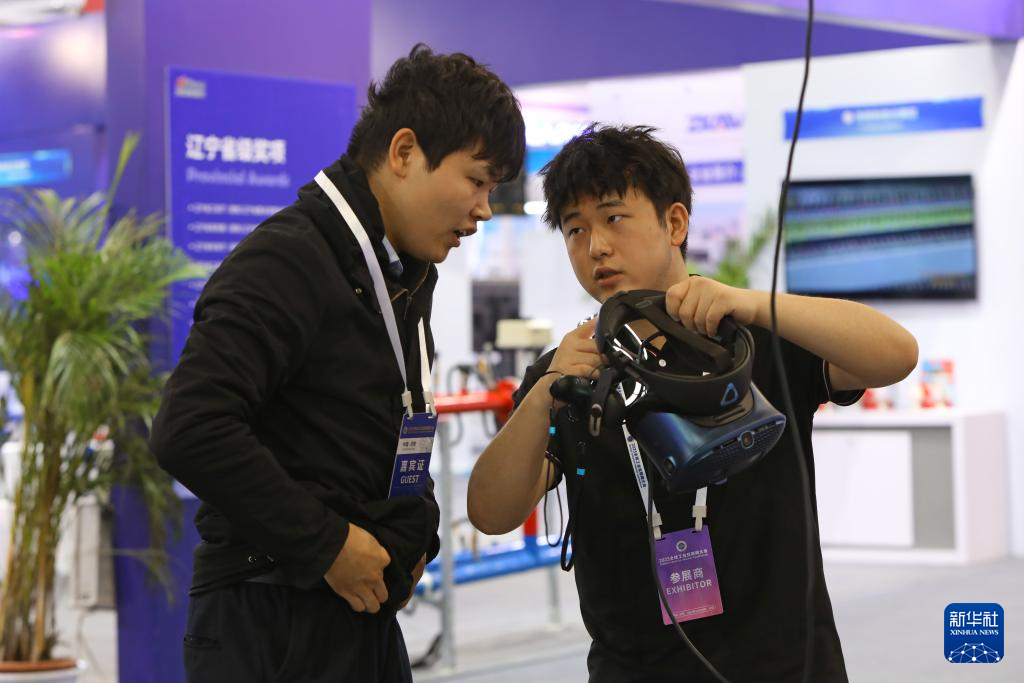 10月18日,参会者在2023全球工业互联网大会上体验工业VR眼镜。