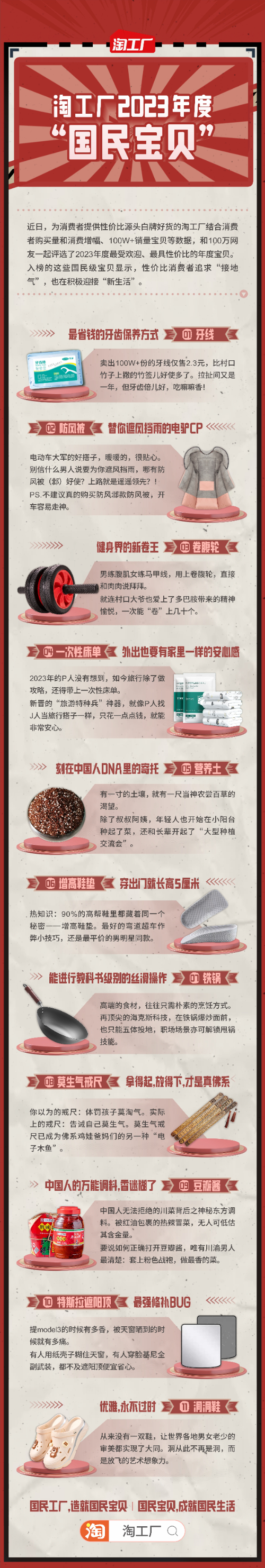 10月30日,淘天集团旗下主打M2C模式的淘工厂在郫县豆瓣酱原产地成都市郫都区发布了《淘工厂2023年度“国民宝贝”》榜单,豆瓣酱、铁锅、潮流新品洞洞鞋、牙线,以及将消费升级值拉满的一次性床单、卷腹轮等商品入选,引发了网友们的共鸣。