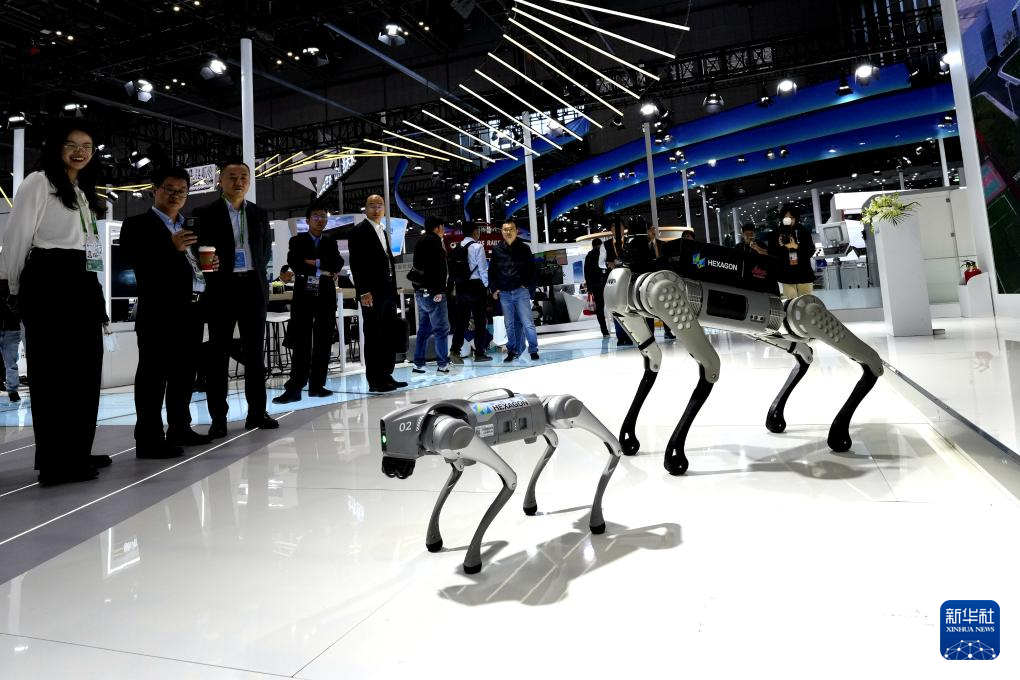 11月7日,在第六届进博会技术装备展区,观众在观看海克斯康展示的智能机器狗。新华社记者 张建松 摄