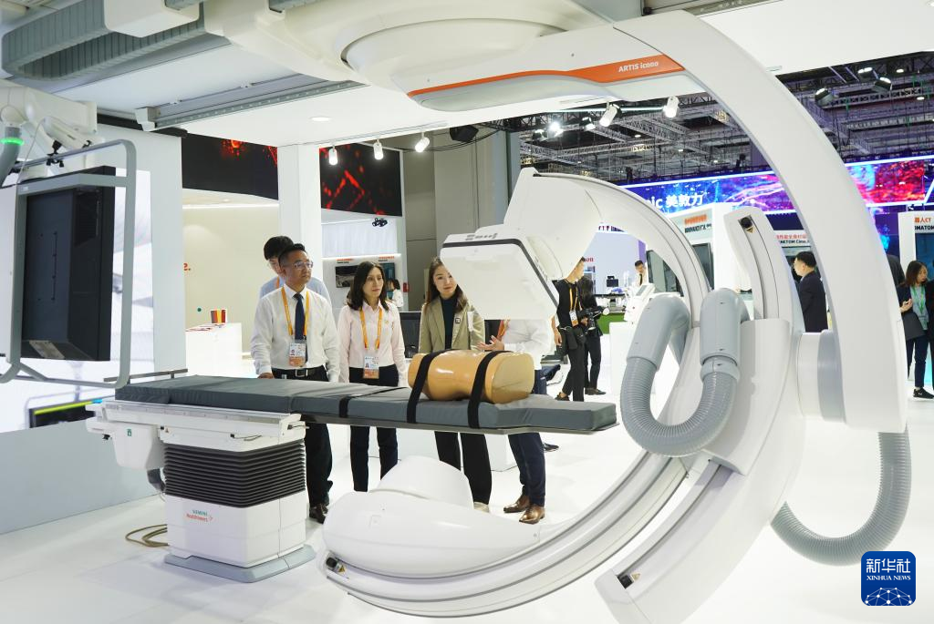 11月6日,在第六届进博会医疗器械及医药保健展区GE医疗展台拍摄的全新一代Apex量子平台。新华社记者 金皓原 摄