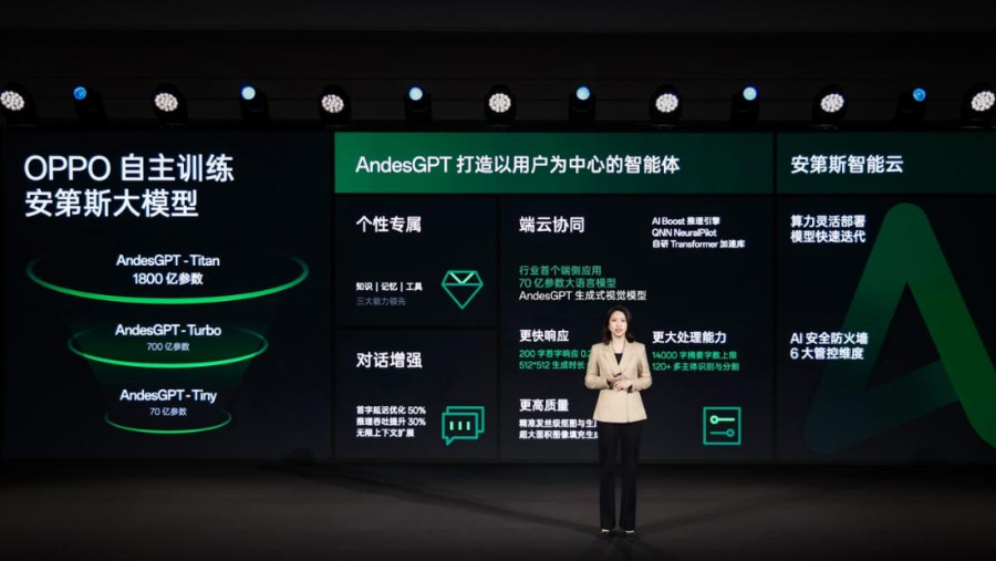 OPPO软件创新中心总经理张峻表示:“OPPO自主训练的、个性专属大模型——AndesGPT包含了从十亿到千亿级参数的多种版本,知识储备丰富、拥有无限记忆、也善用工具;端云协同的技术架构,可以支撑多元化的应用场景。在多种技术的配合下,我们也将会在Find X7系列首次实现端侧应用70亿参数的大语言模型,以及生成式的视觉模型,在保障用户隐私安全的情况下,带来响应更快、处理能力更强、生成质量更高的本地AI体验。”