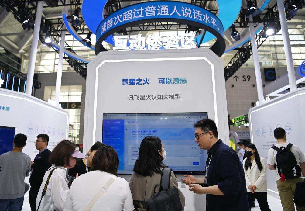 2023年5月18日,观众在第七届世界智能大会智能科技展上参观科大讯飞展区。新华社记者李然摄