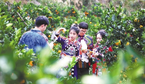 2023年11月29日,在重庆市秀山土家族苗族自治县洪安镇贵措社区,青年主播们正在果园里通过直播展示脐橙。胡 程摄(中经视觉)