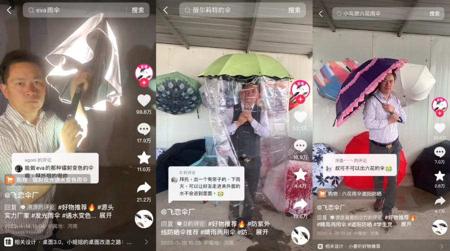“叔,我想要一把陪我走夜路的伞。”女孩许愿。下一秒,她得到了一把握柄处带照明灯的雨伞。此外,双人伞、钓鱼伞、儿童伞……只要有人提出要求,“叔”就能让他愿望成真。这段《神奇雨伞店》片中的场景,展示的正是绍兴飞恋伞厂厂长雷鹏琳在抖音电商的真实经历。过去一年,凭借脑洞大开“闪瞎”用户的雨伞创意,雷鹏琳带领飞恋伞厂在抖音电商找到了一条新销路。