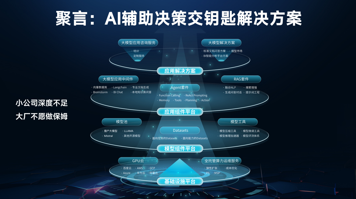 在实践中猎户星空发现,企业需要的不是大模型,而是能够结合业务流并解决自身痛点的大模型应用。“聚言”就以猎户星空大模型为基座,结合场景应用微调套件,通过全链条的AI大模型咨询定制,为客户提供AI辅助决策交钥匙解决方案。