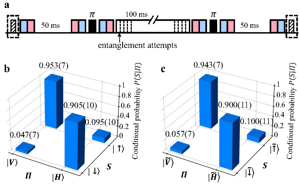 实验发现,通过此方法制备出的通讯比特,可在数百毫秒的时间内生成离子-光子纠缠;通过自旋回波方法可延长存储比特的存储寿命,实现相干时间达到秒量级的存储量子比特。通过比较有无离子-光子纠缠生成操作时存储比特的保真度变化,研究人员证实了两种量子比特之间低于实验精度的串扰误差,从而实现了无串扰的量子网络节点。