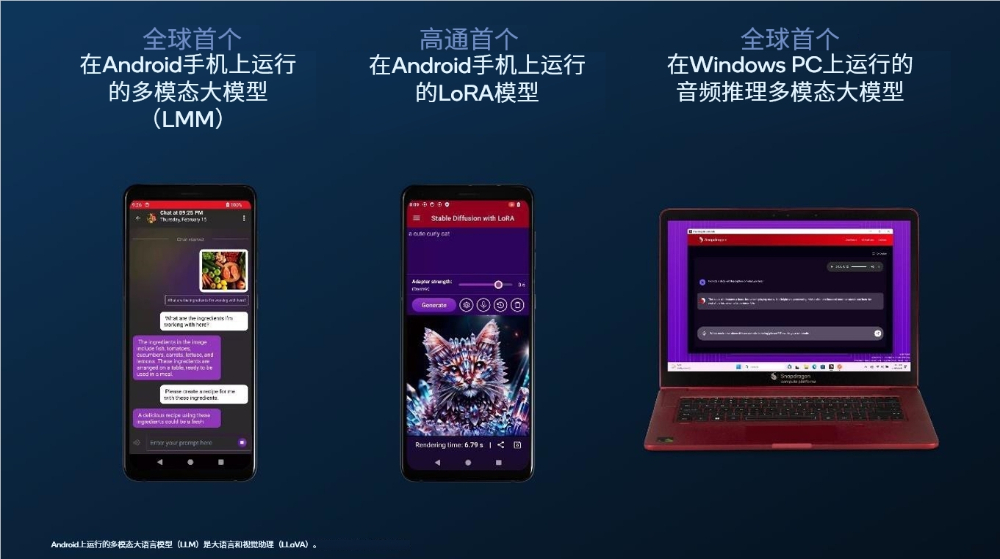 多模态AI模型不仅能够接受文本输入,还可以接受图像、音频等其它输入数据类型。会上,高通AI研究演示了在安卓智能手机和Windows PC上运行多模态大模型和定制大视觉模型,展示终端侧AI的应用潜力。