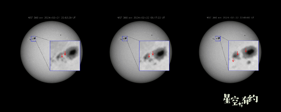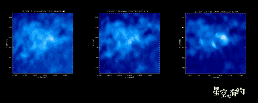 最近3个X级耀斑(22日X1.8级耀斑、22日X1.7级耀斑和23日X6.3级耀斑)发生时“夸父一号”白光望远镜拍摄到的影像。(“夸父一号”研究团队供图)
