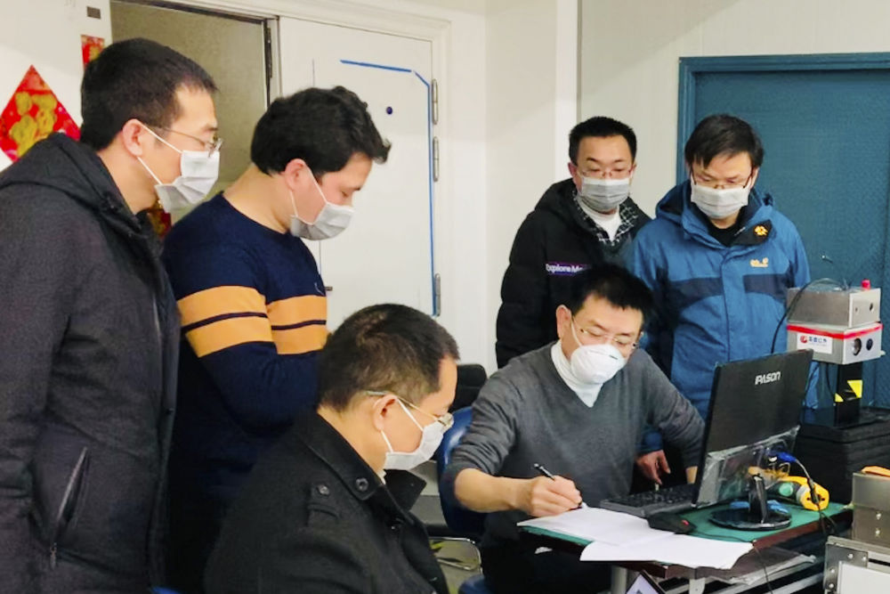 黄立(右三)与科研人员在高德红外生产调试车间忙碌(2020年2月11日摄)。新华社发