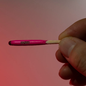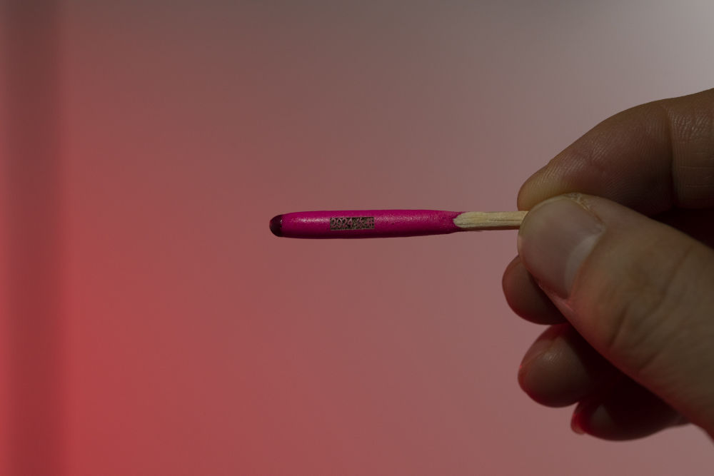 1月19日,在位于西安的中科微精总部车间,工作人员展示用超快激光微加工技术在火柴头上刻的字:2024您好。