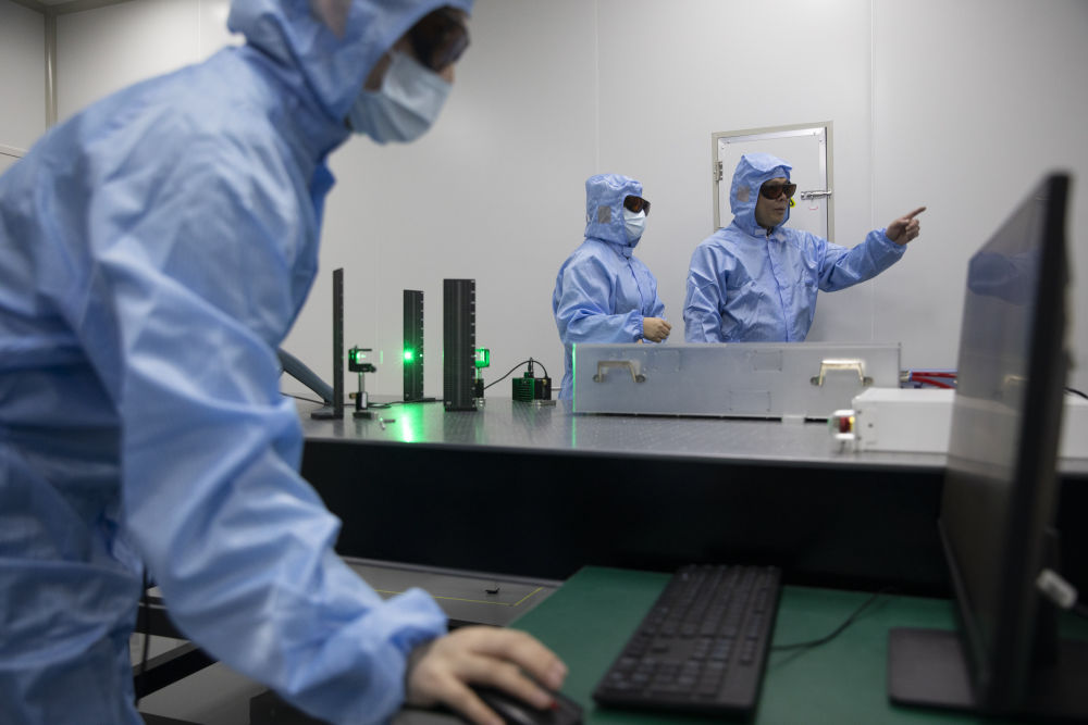 1月17日,在位于西安的中科微精总部实验室,杨小君(右)在调整实验设备。