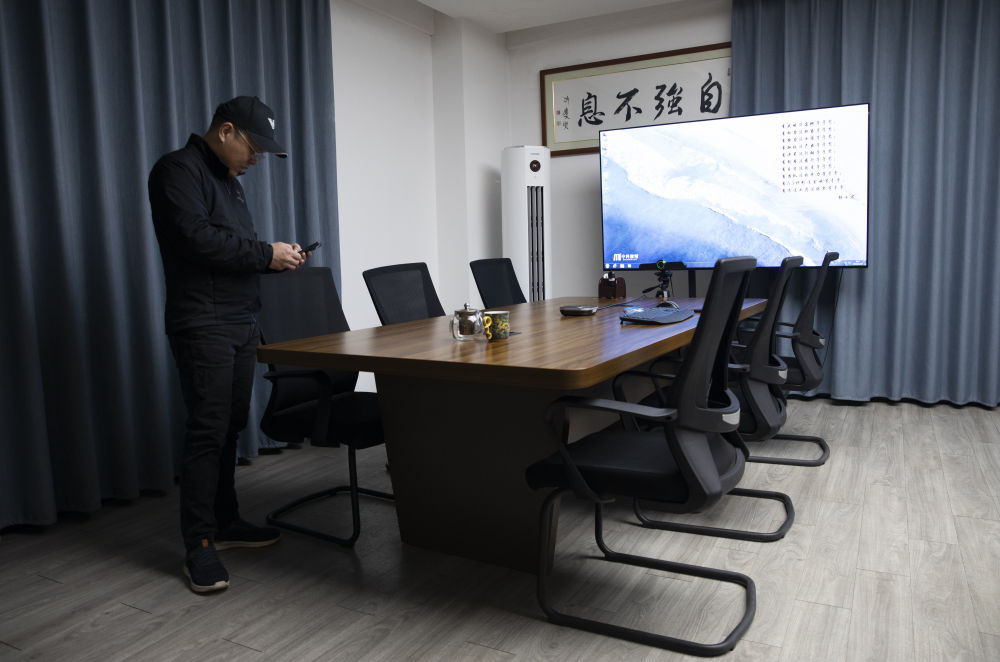1月18日,杨小君在位于西安的中科微精总部会议室等待员工们过来开会。