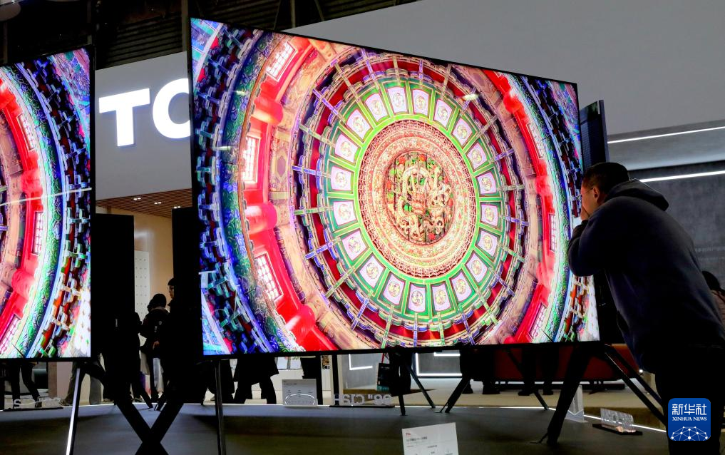 3月14日,一名参观者在TCL公司展台上近距离观察一款电视展品的屏幕。