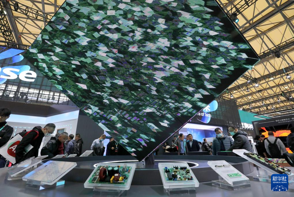 3月14日,参观者在海信公司展台上观看电器控制芯片组的展示。