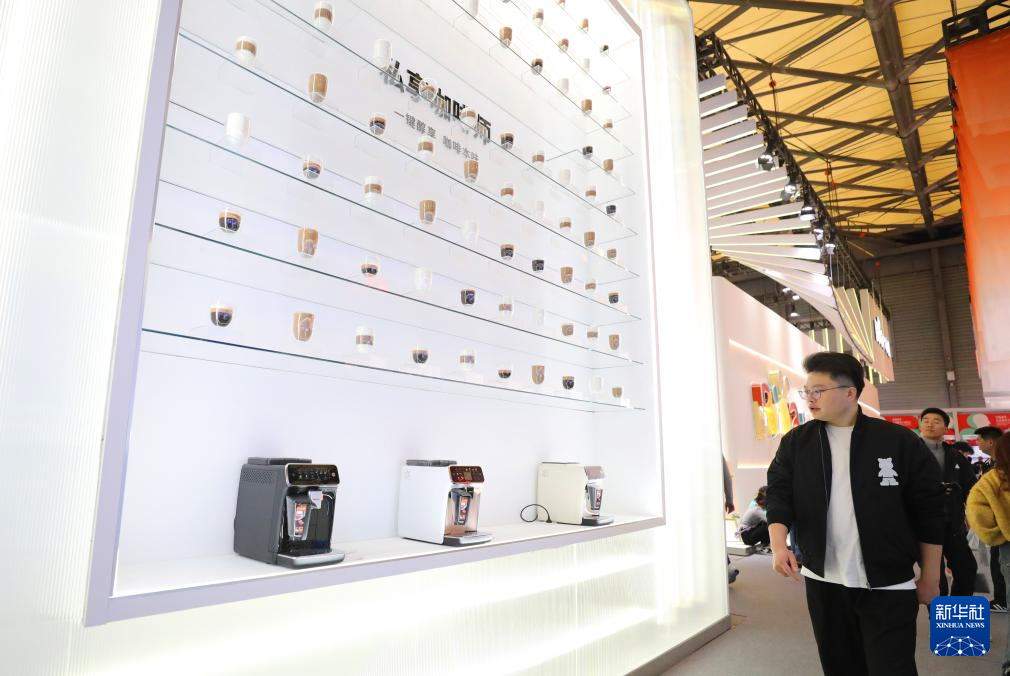 3月14日,参观者在飞利浦公司的咖啡机技术演进历史回顾展区前驻足观看。
