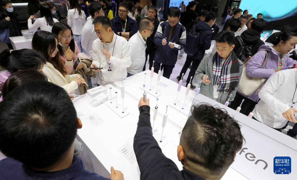3月14日,参观者在徕芬公司的电动牙刷展台前交流讨论。