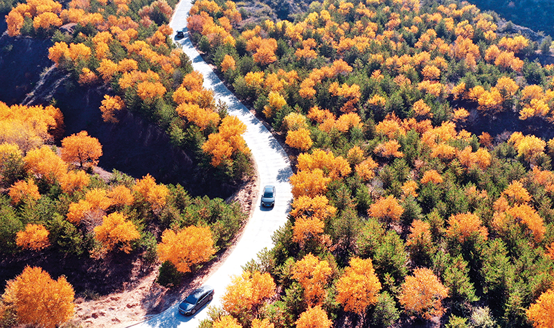 游客自驾在陕西省神木市栏杆堡镇訾大庄村山林游玩(2021年10月31日摄) 陶明摄/本刊
