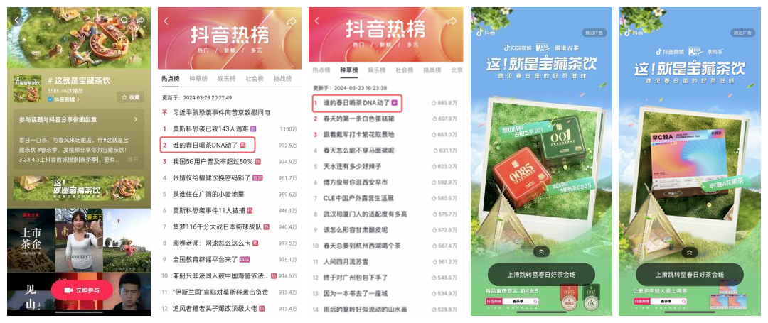 本次活动成功帮助茶品牌实现声量销量双重突破。3月23日活动首日定制话题#谁的春日喝茶DNA动了,排名抖音热榜前二、种草榜第一,话题曝光量超过7700万;活动主话题#这就是宝藏茶饮视频播放总量超过5586万;活动累计相关搜索词达到42万,搜索GMV爆发151%。