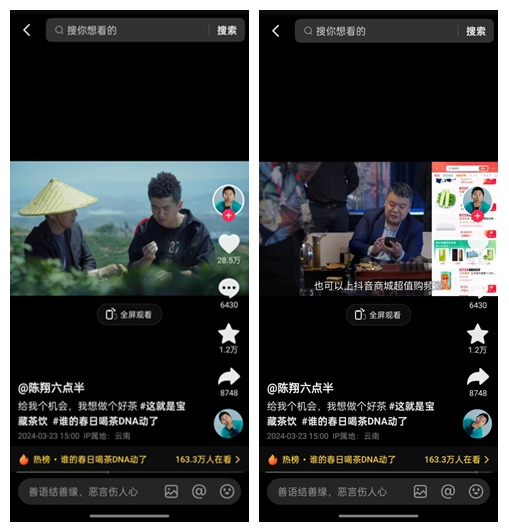 从短视频跳转到直播下单,从线下推广走进线上商城,从好茶种草榜单到低价好物超值购,抖音商城用“一个屏幕”直达用户需求,缩短消费者与茶源的距离,让商家与用户“一个卖得好,一个买得值”,助推茶类品牌品效合一、声量销量双丰收。