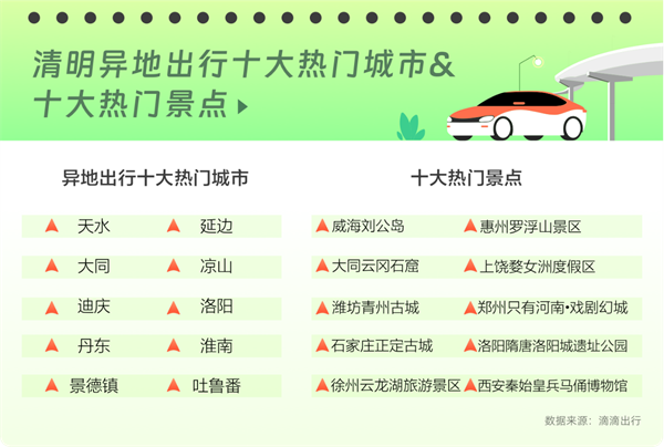 清明假期,前往旅游景点的打车需求同比去年上涨92%。大同云冈石窟、郑州只有河南·戏剧幻城、上饶婺女洲度假区、潍坊青州古城、洛阳隋唐洛阳城遗址公园、惠州罗浮山景区、石家庄正定古城、西安秦始皇兵马俑博物馆、徐州云龙湖旅游景区、威海刘公岛成为今年清明十大热门景点,打车需求同比去年上涨均超过6倍,其中前往云冈石窟的滴滴打车需求同比去年上涨超20倍;只有河南·戏剧幻城、婺女洲度假区的打车需求同比去年分别上涨13倍、12倍。