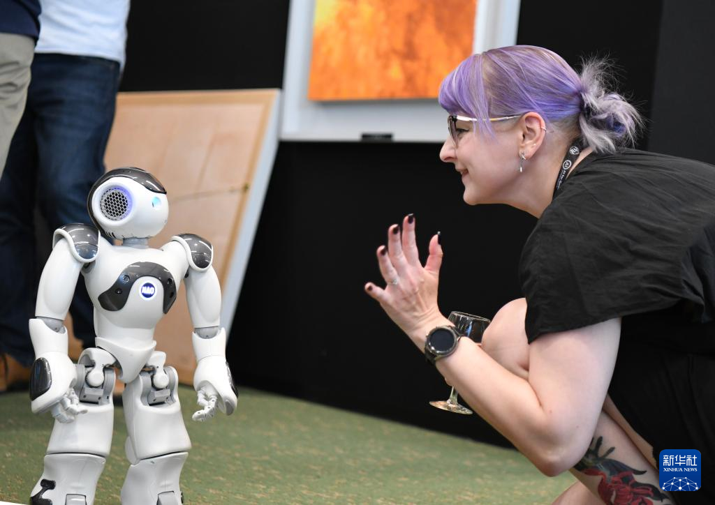 2023年7月7日,在瑞士日内瓦“人工智能造福人类全球峰会”上,一名参会者与机器人互动。新华社记者连漪摄